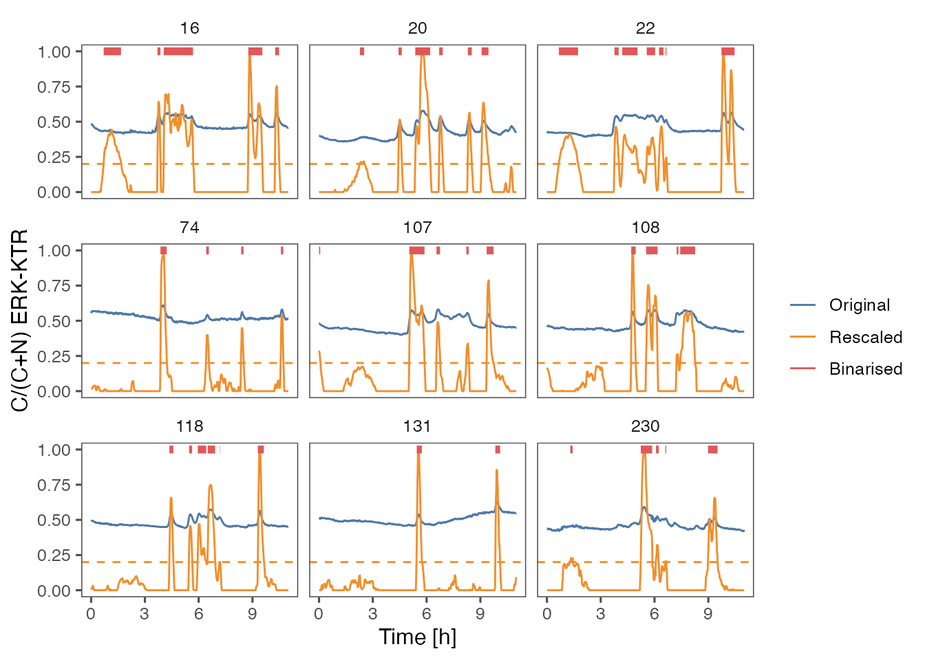 ARCOS-binTimeseries.RmdUsing ARCOS to detect collective activation events in biological systems requires identification of active objects, i.e., objects that will be passed to the clustering algorithm. In practice the single-cell activity obtained from image segmentation needs to be thresholded and binarised. ARCOS offers several approaches to perform such approaches that will be covered below.