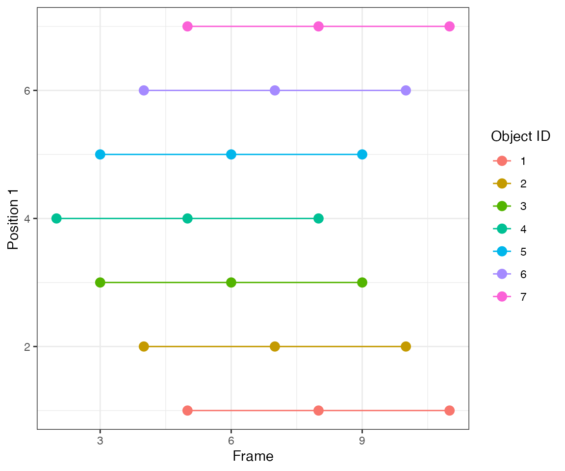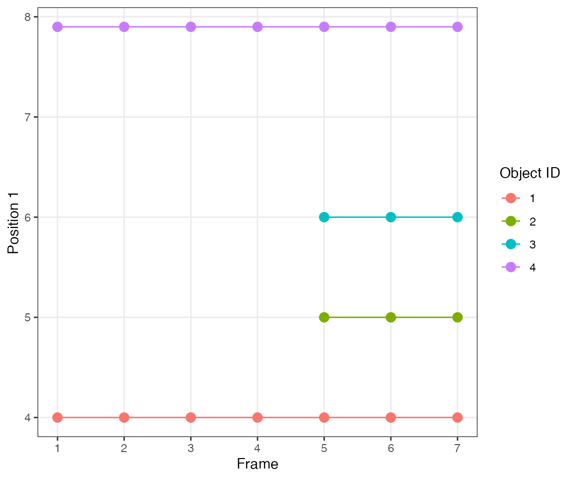 Consider 7 objects that become subsequently active every 2 frames. It mimics an activity wave spreading from object #4 to neighbouring objects.